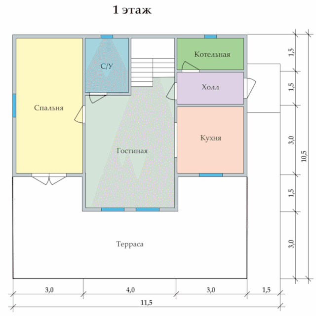 1) Первый этаж: небольшой холл, просторная Пинап изолированная спальня с отдельным выходом на террасу, а также кухня, санузел и специальное помещение под котельную.