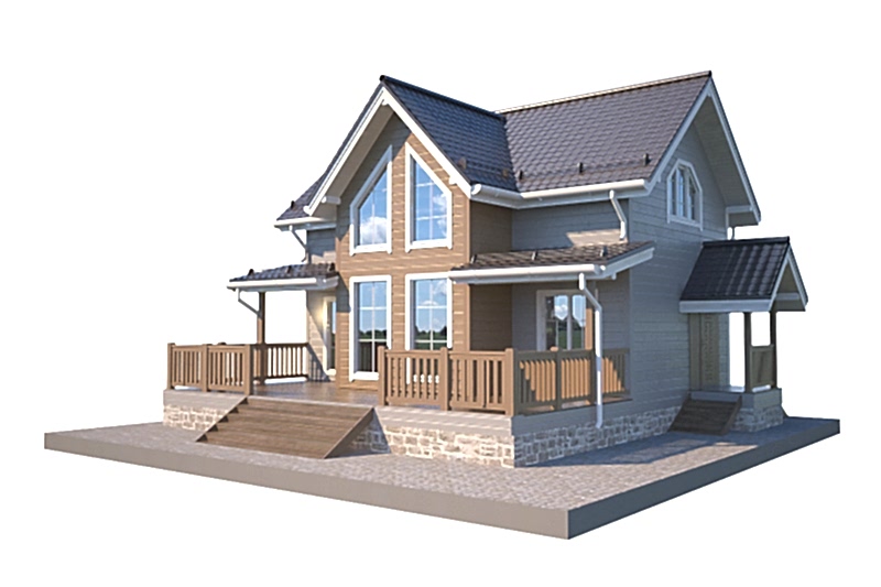 Дом «Восход 11,5х10,5» отличается от традиционных каркасных конструкций визуальной сложностью исполнения. Он смотрится по-настоящему роскошно, напоминая современный двухэтажный особняк.